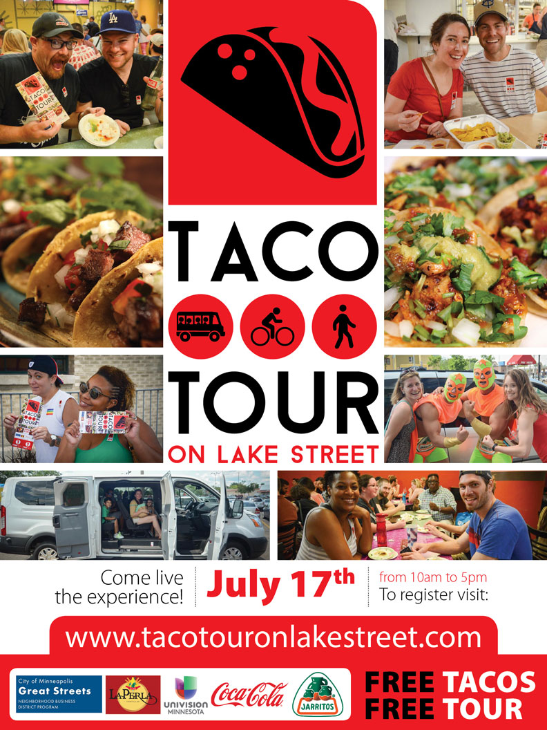 The third annual Taco Tour on Lake Street! Discover the spicy flavors of the Latino food district on Lake Street by touring 10 authentic restaurants offering their own versions of the iconic Mexican specialty: TACOS! Last year more than 2,500 people participated in the wildly successful Taco Tour, and we were named Best Crawl by City Pages' Best of the Twin Cities edition.